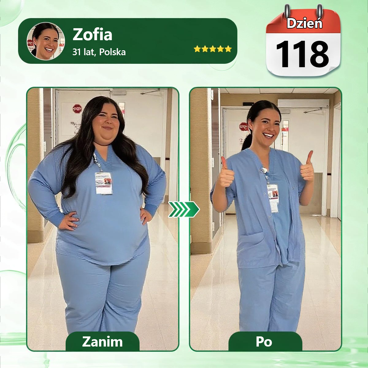 „Dziesięć lat pracy jako pielęgniarka zrujnowało moje zdrowie. Z powodu szalonych zmian musiałam pomijać posiłki przez osiem godzin, a po powrocie do domu, wyczerpana, zjadałam wszystko, co tylko znalazłam. Moja waga wzrosła z 160 do 287 funtów — moje ubrania robocze ledwo na mnie pasowały, a podczas jednej zmiany prawie straciłam przytomność z powodu niskiego poziomu cukru we krwi. Mój lekarz powiedział, że mam stan przedcukrzycowy. Kolega wspomniał o Kkio® Moringa·Berberyna × NAD+ 10 w 1 nano mikroigłowym plastrze i, szczerze mówiąc, nie spodziewałam się wiele. Ale w ciągu dwóch tygodni mój apetyt całkowicie wrócił do normy. Zmniejszyła się ochota na cukier, a po nocnych zmianach już nie byłam wilczy głód.